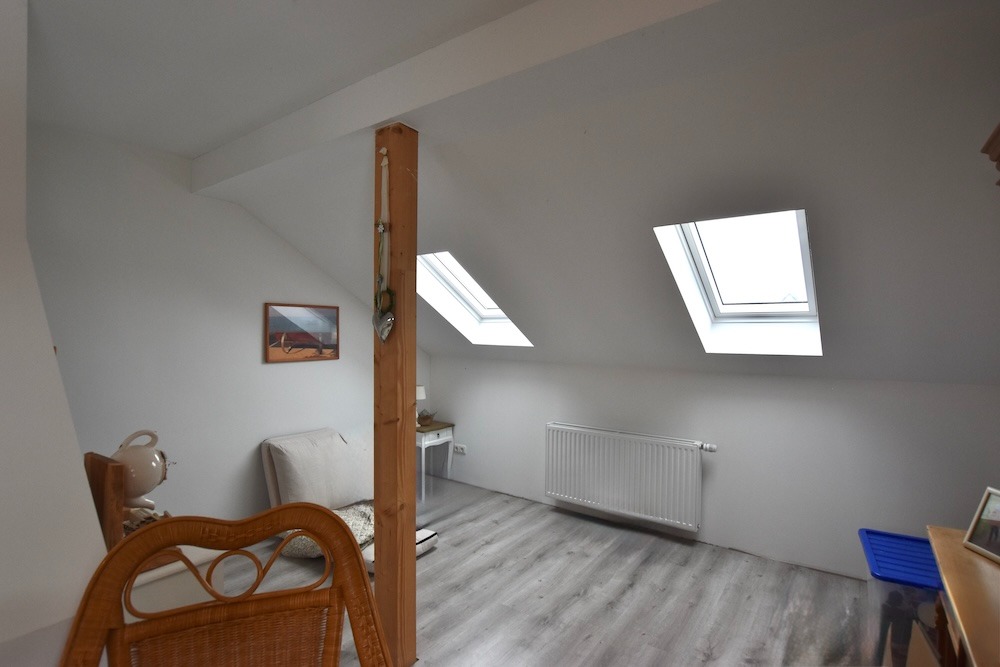 Über eine Holztreppe gelangt man in den ersten Stock. Hier befinden sich drei weitere Zimmer, die individuell als Schlaf-, Arbeits- oder Gästezimmer bzw. als weiteres Wohnzimmer genutzt werden können.
