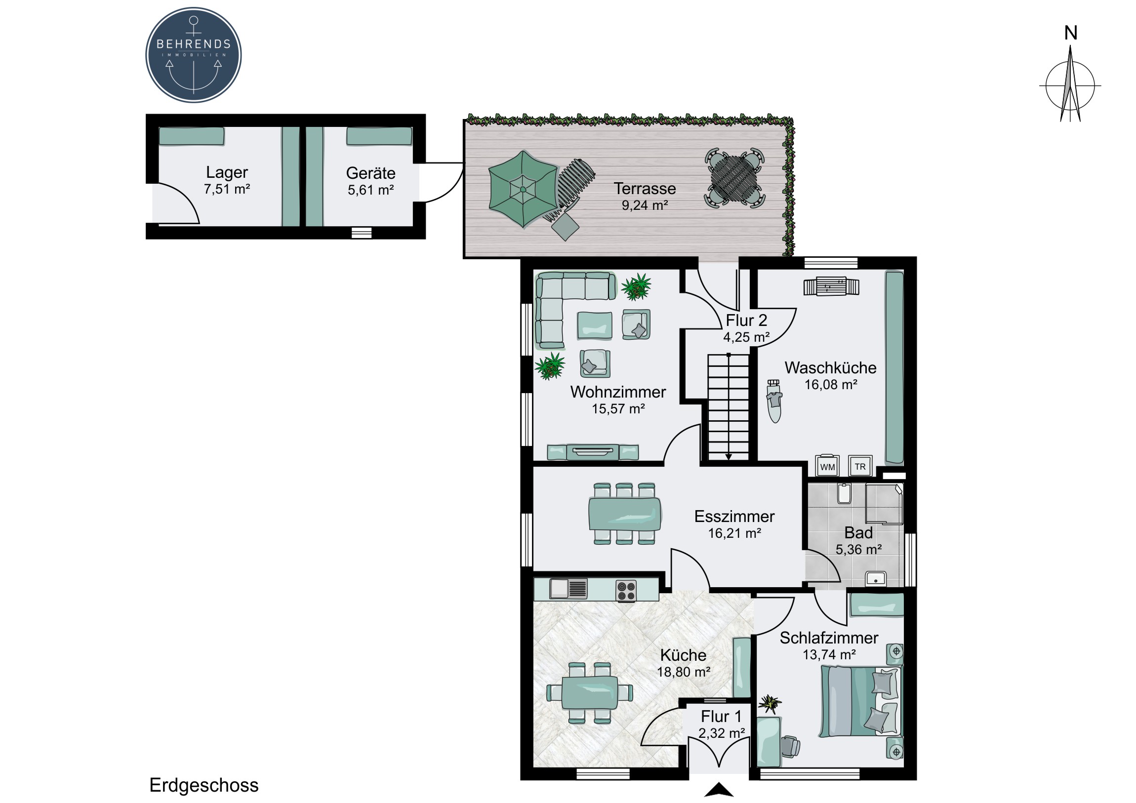 Im Erdgeschoss befinden sich ein Wohnzimmer, ein separates Esszimmer, auch als zweites Schlafzimmer nutzbar, sowie eine Küche. Darüber hinaus stehen ein Duschbadezimmer, ein Schlafzimmer und ein praktischer Hauswirtschaftsraum zur Verfügung, der zusätzlichen Stauraum bietet und die alltägliche Organisation erleichtert und Platz für eine Waschmaschine und Trockner ermöglicht.