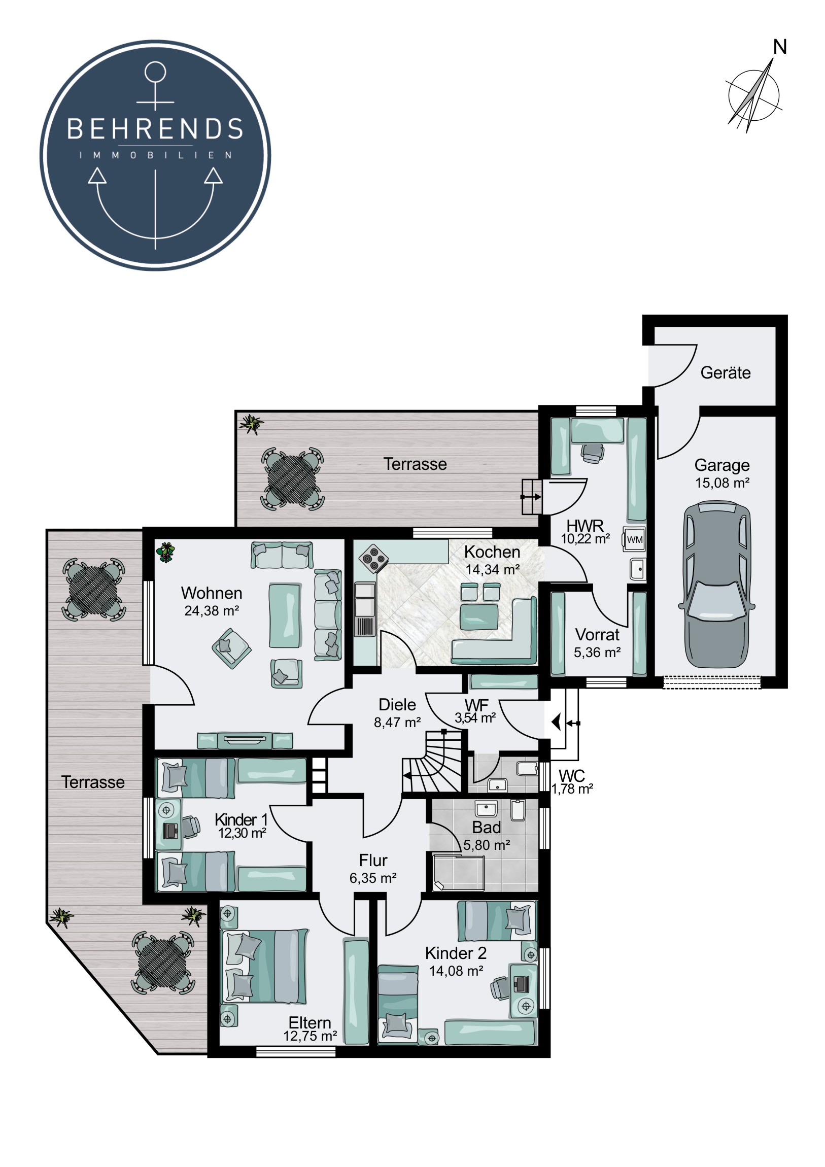 Ergänzt wird das Raumangebot durch einen Hauswirtschaftsraum sowie einen angrenzenden Vorratsraum, die zusätzlichen Stauraum bieten.