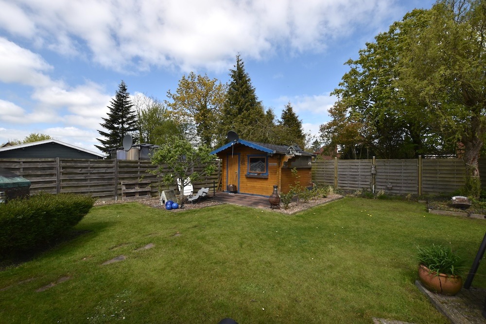 Der Garten ist pflegeleicht angelegt und verfügt über eine Holzhütte für zusätzliche Abstellmöglichkeiten.